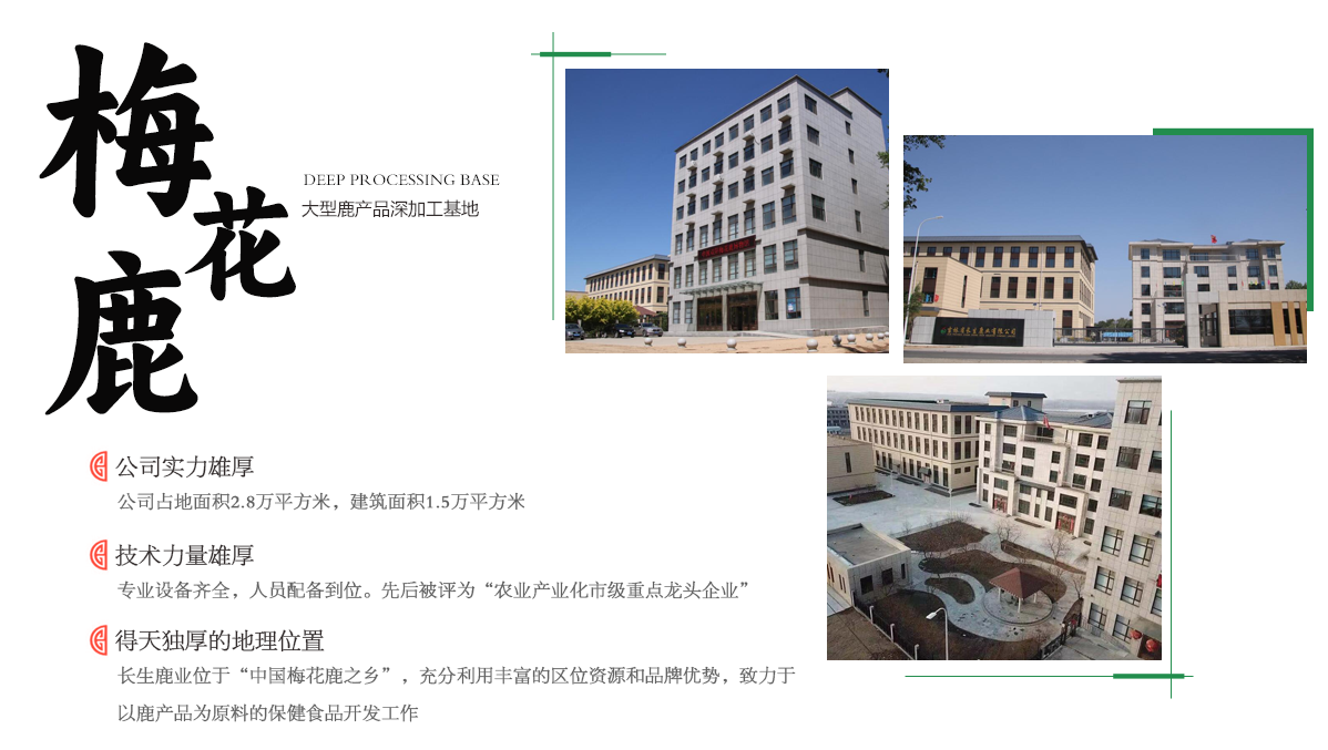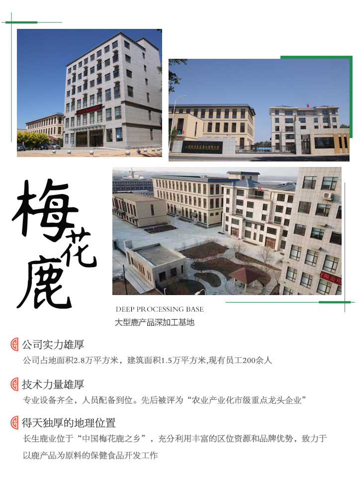 吉林省長(zhǎng)生鹿業(yè)有限公司坐落于被國(guó)務(wù)院命名“中國(guó)梅花鹿之鄉(xiāng)”吉林省長(zhǎng)春市雙陽(yáng)區(qū)鹿鄉(xiāng)鎮(zhèn)鹿鄉(xiāng)大街1111號(hào),由全國(guó)勞動(dòng)模范、中國(guó)“養(yǎng)鹿大王”稱號(hào)的劉長(zhǎng)生于2000年創(chuàng)辦,是一家致力于以人類健康產(chǎn)業(yè)為主,集研發(fā)、生產(chǎn)、銷售為一體的企業(yè)。 公司擁有多項(xiàng)自主知識(shí)產(chǎn)權(quán)和致力于以鹿為原材料的保健食品研發(fā)生產(chǎn),符合國(guó)家行業(yè)標(biāo)準(zhǔn)和農(nóng)業(yè)產(chǎn)業(yè)化規(guī)劃要求,利用得天獨(dú)厚的地理資源,從公司強(qiáng)化創(chuàng)新驅(qū)動(dòng)、科技賦能,為了高質(zhì)量發(fā)展深受國(guó)家、省、市各級(jí)政府和領(lǐng)導(dǎo)提供的動(dòng)力支撐,先后被評(píng)為“長(zhǎng)春市專精特新中小企業(yè)”、“吉林省專精特新中小企業(yè)”、“長(zhǎng)春市科技型小巨人企業(yè)”、“吉林省科技型小巨人企業(yè)”、“農(nóng)業(yè)產(chǎn)業(yè)化市級(jí)龍頭企業(yè)”、“農(nóng)業(yè)產(chǎn)業(yè)化省級(jí)龍頭企業(yè)”等榮譽(yù)。公司具有完善的法務(wù)管理結(jié)構(gòu)和健全的管理體系,建立嚴(yán)格的質(zhì)量保證體系和完善的生產(chǎn)管理體系。緊緊圍繞創(chuàng)新驅(qū)動(dòng)發(fā)展戰(zhàn)略,推進(jìn)創(chuàng)新平臺(tái)建設(shè),與多家大學(xué)、研究所合作加快產(chǎn)學(xué)研深度融合,利用現(xiàn)代生物技術(shù)研發(fā)以鹿為原材料的系列產(chǎn)品。對(duì)于以馬鹿茸為原材料具有“提高免疫力”、“緩解體力疲勞”功效的“健鹿生牌馬鹿茸片”保健食品批準(zhǔn)文件打破了以鹿茸為原材料的產(chǎn)品批復(fù)的先例,對(duì)于科技研發(fā)有了重大突破。“健鹿生”品牌系列保健食品、普通食品;及以“健鹿美”品牌系列化妝品等三十多個(gè)產(chǎn)品,其獨(dú)特的品質(zhì)和多樣性,受到消費(fèi)者喜愛(ài);公司以自身為核心創(chuàng)建吉林雙陽(yáng)梅花鹿產(chǎn)品進(jìn)出口基地,形成了三產(chǎn)深度融合的閉環(huán)式發(fā)展新格局,產(chǎn)品不僅在國(guó)內(nèi)市場(chǎng)暢銷,逐步打開(kāi)國(guó)際市場(chǎng)。